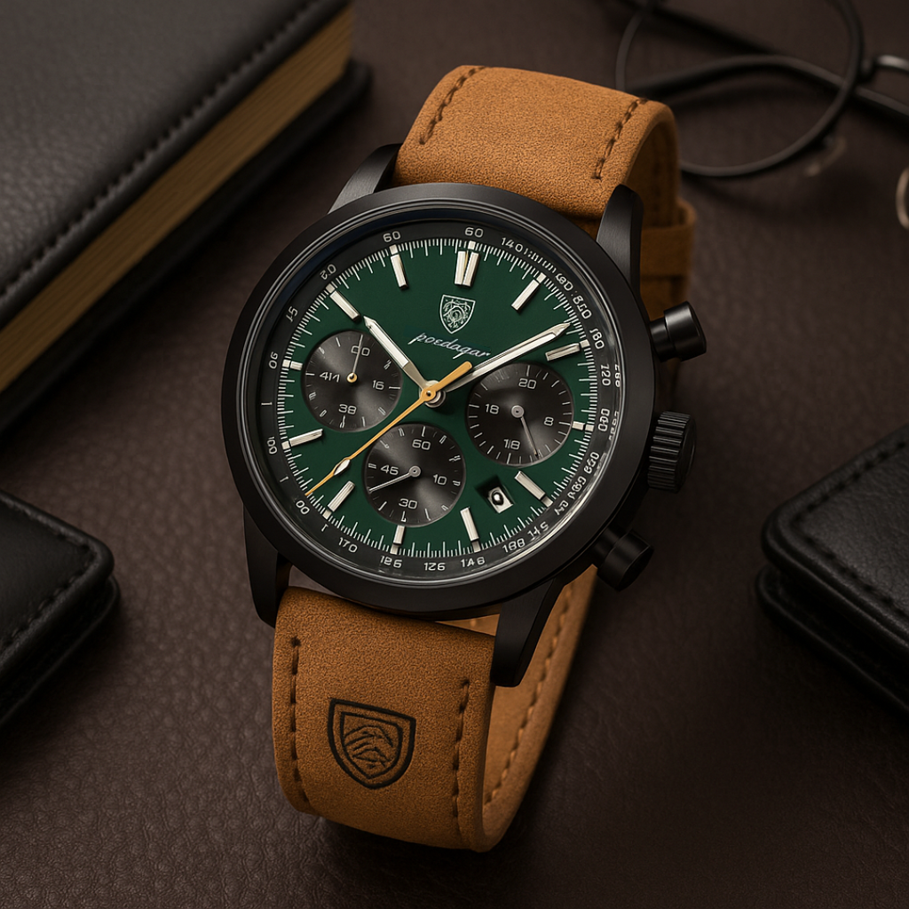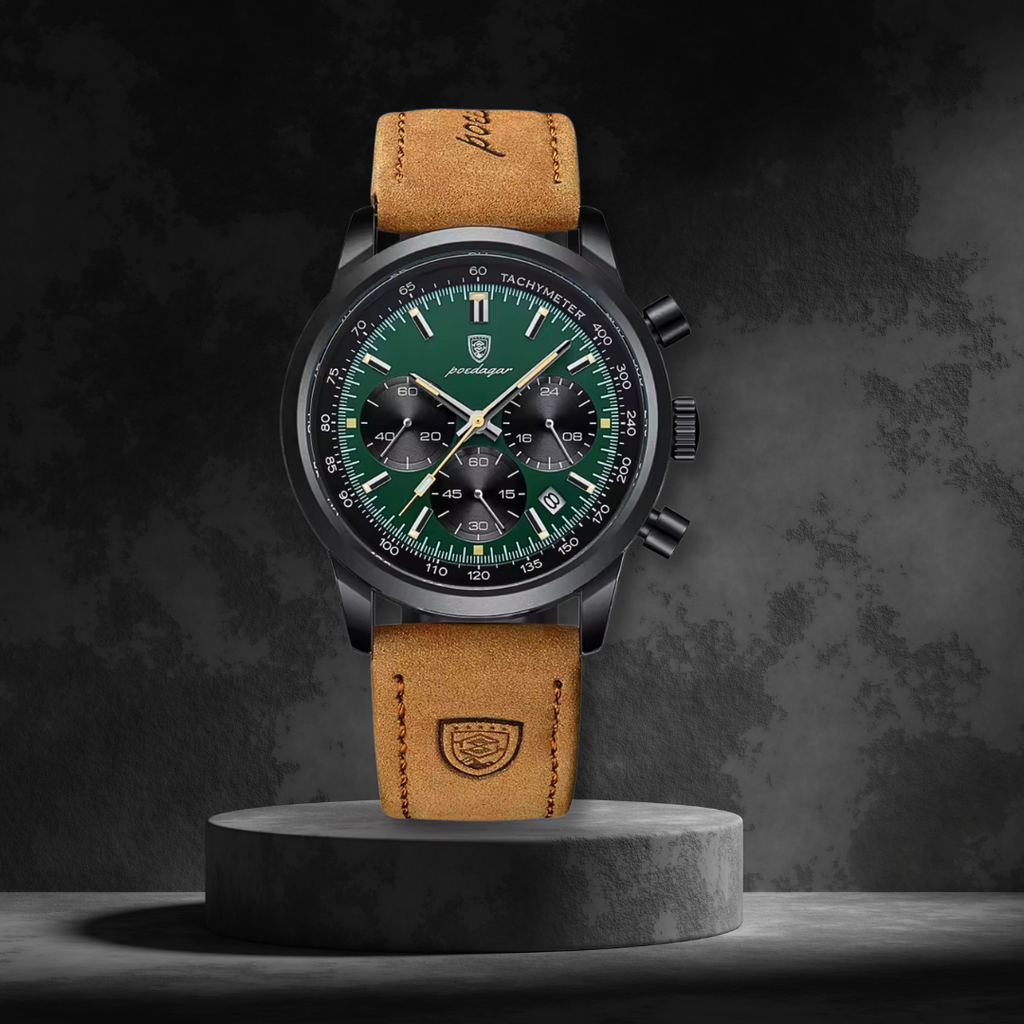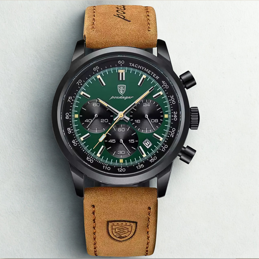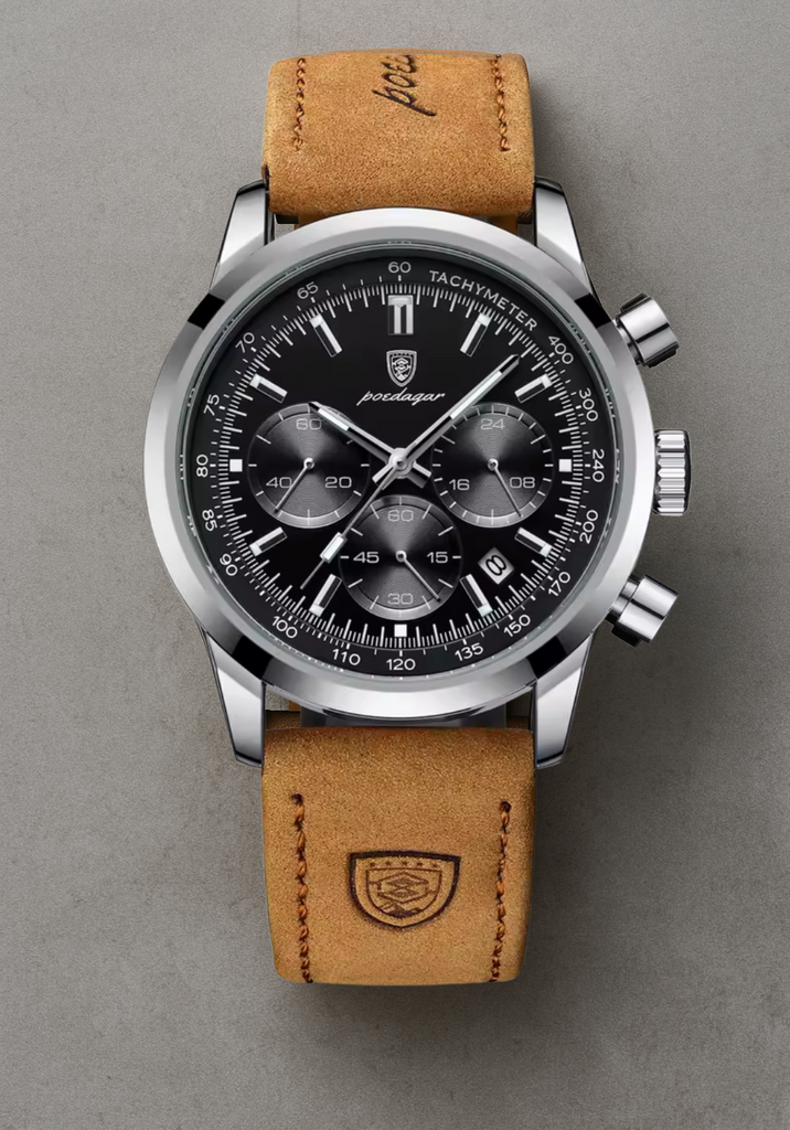 El Poedagar Viper está diseñado para hombres que se mueven con seguridad y marcan territorio sin necesidad de hablar. Su diseño combina un dial agresivo con cronógrafo funcional, correa de cuero genuino y acabados que no pasan desapercibidos.