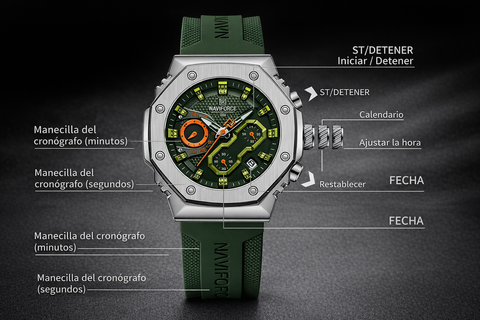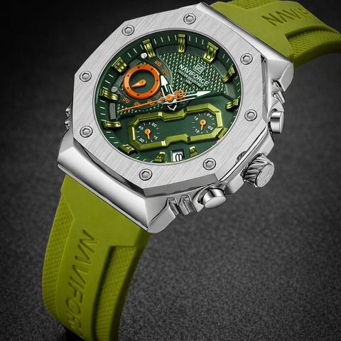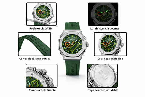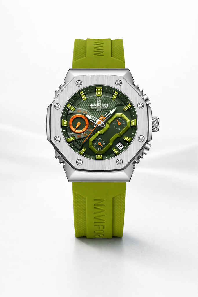 Su caja de acero inoxidable con acabado plateado brinda resistencia y presencia, mientras que la correa de silicona verde aporta comodidad y un toque audaz. La esfera verde con textura geométrica y subesferas funcionales refleja carácter, precisión y personalidad.